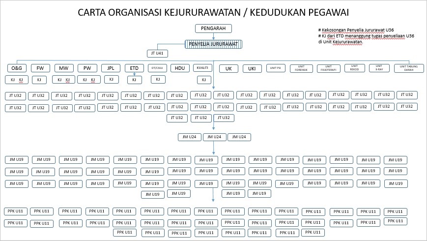 Unit kejururawatan belum mempunyai Penyelia Jururawat gred U36 setakat ini dan tugas Penyelia Jururawat ditanggung oleh KJ Nesline Kinat gred U32 dan dibantu oleh seorang Jururawat Masyarakat U19. Secara keseluruhannya setakat bulan September 2019, mempunyai seramai 157 jururawat pelbagai kategori dan seramai 38 0rang Pembantu Perawatan Kesihatan (PPK). Jumlah keseluruhan anggota kejururawatan sehingga bulan September seramai 195 orang.