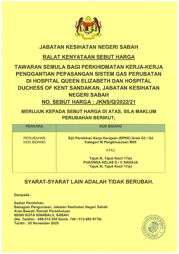 (RALAT) TAWARAN BAGI PERKHIDMATAN KERJA-KERJA PENGGANTIAN PEPASANGAN SISTEM GAS PERUBATAN DI HOSPITAL QUEEN ELIZABETH DAN HOSPITAL DUCHESS OF KENT SANDAKAN, JABATAN KESIHATAN NEGERI SABAH