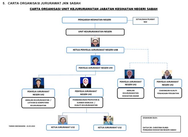 - Bahagian Kejururawatan Malaysia diketuai oleh Pengarah Jururawat Malaysia seretusnya Pentadbiran Jururawat di JKN Sabah di ketuai oleh Ketua Penyelia Jururawat Negeri.